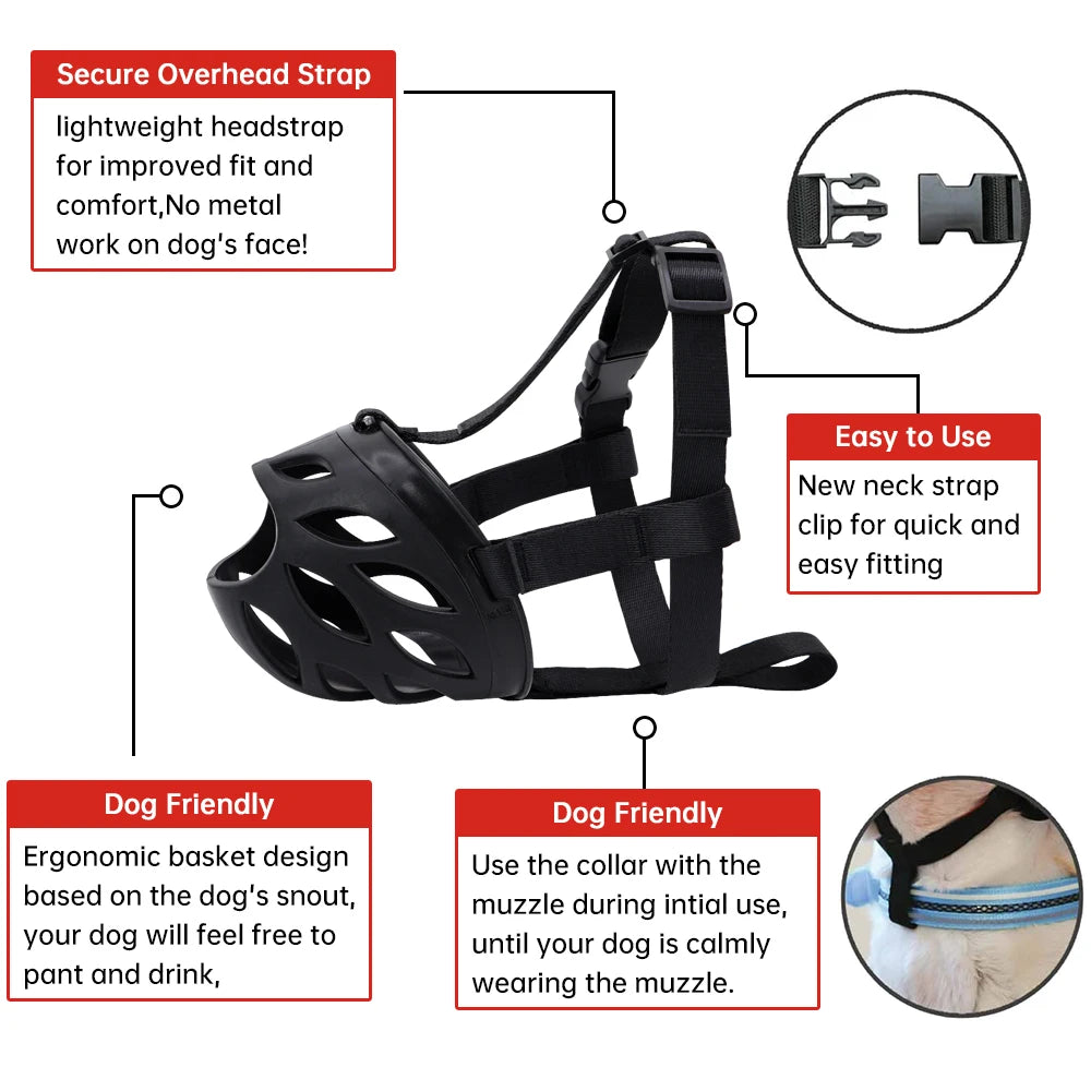 Color: BlackMaterial: RubberFeatures: High quality real leather material, comfortable and durable. With fixed tape, easy to wear.Usage: Dog Training, no bark, no biteFit for small, medium and large dogs, Retriever/Pitbull/Boxer and other same size dogsPlease note:Before you order, be sure your dog's mouth is suitable (that's very important).